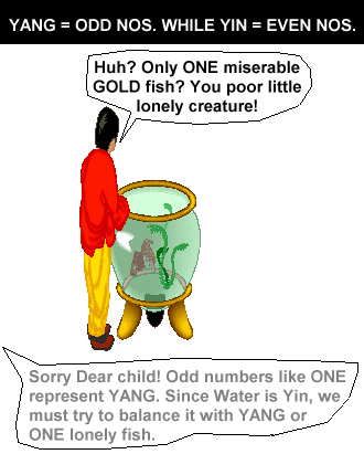 - To balance the water (yin) in the fish tank, one concept is to go for odd number fishes. As odd numbers represent Yang. Thus; this is to seek a balance of both yin and yang.